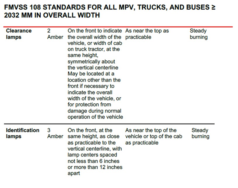 For a long time, fire apparatus manufacturers have been responsible for the spacing and configuration of marker lights. This impacts many Fire Apparatus Manufacturers’ Association (FAMA) members. Marker lights are required on all vehicles, including fire trucks. Manufacturers are required to follow Federal Motor Vehicle Safety Standard 108 (FMVSS 108), which defines where and how marker lights must be installed. Just because a fire apparatus is big, red, and gets to call for right of way while responding, doesn’t mean it gets a pass from the law.
