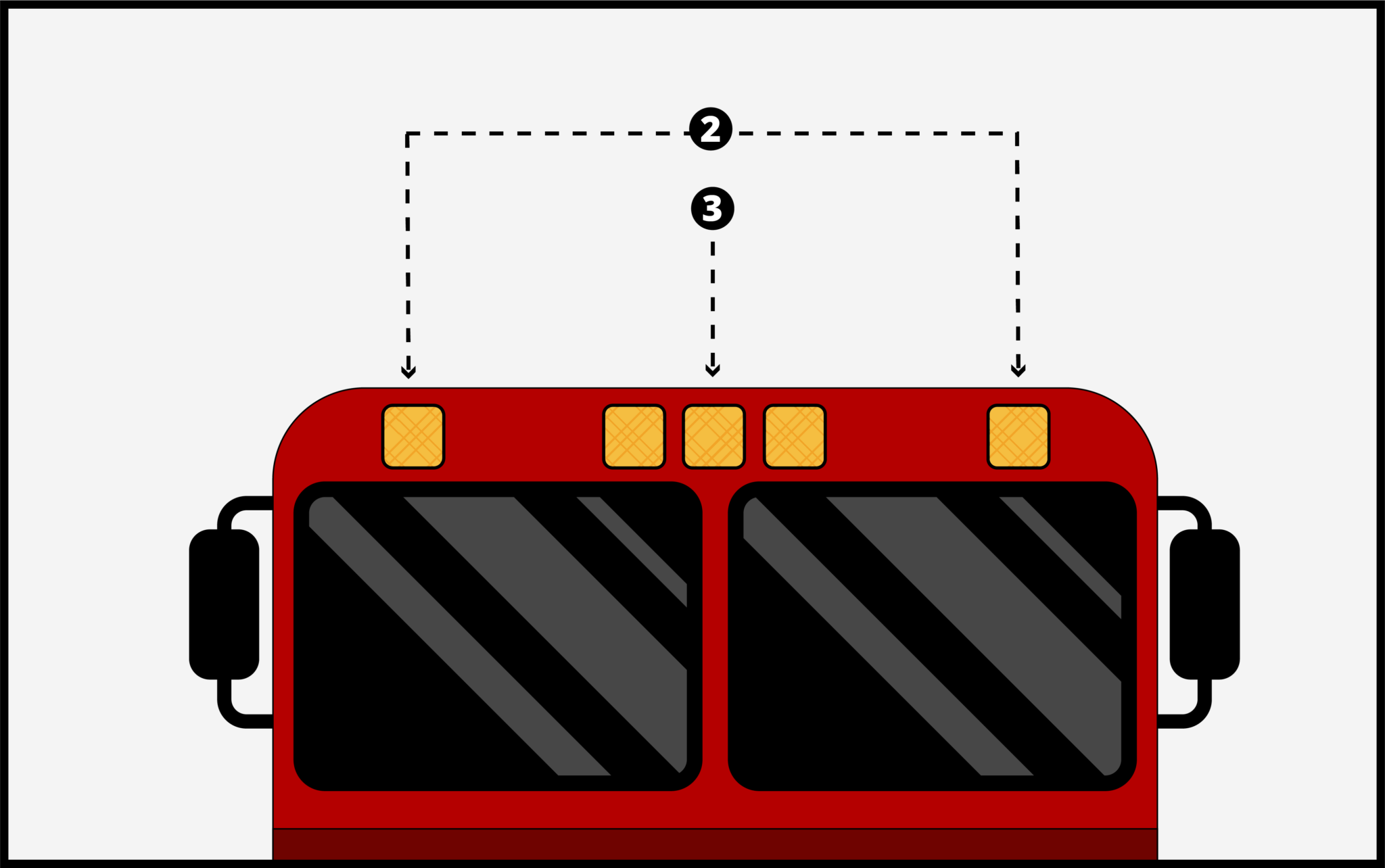 Identification marker lights are a group of three lights, with the middle fixture mounted on the centerline of the vehicle. These fixtures create a visual signature that identifies the vehicle as wider than 2,032 mm (80 inches). This group of fixtures must always be a group of exactly three, placed no closer than 6 inches and no further than 12 inches apart.