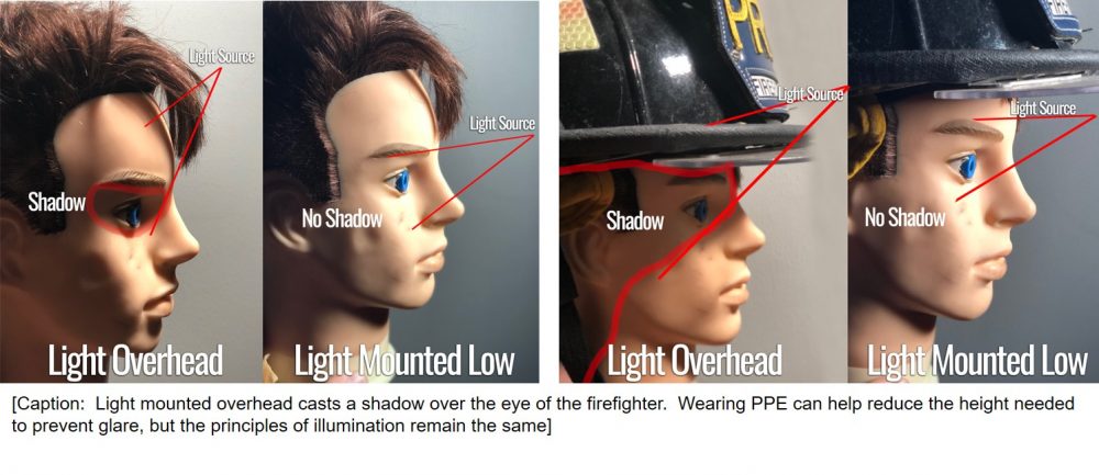 Here’s the science: humans have two eyeballs each recessed in to a socket on the frontal bone of the scull. Above that socket, there is a bony structure called the supraorbital ridge over which the eyebrows typically align. When the sun shines down on a human’s skull, this bony structure, coupled with the eyebrows and eyelashes, casts a shadow which typically occludes the eye and prevents the sun from shining directly in the eyes of people as they work. When specifying a fire apparatus, firefighters should keep the basic biology of the human body in mind, and specify scene lights which can be placed as high overhead as practical, so that the Firefighter’s PPE and the natural shape of the human skull help prevent glare from hitting the crews in the eyes at night.