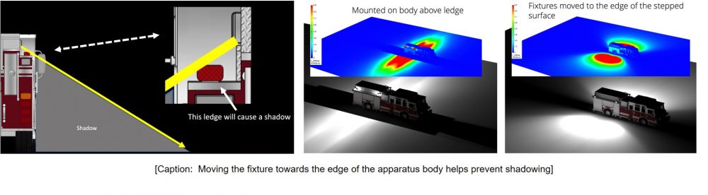Light doesn’t bend! Think about fixture placement and the shadows that will be created when you select a mounting location! If you mount a scene light with asymmetric optics on the side of a stepped pumper body (say, on the vertical surface near where the hard suction may be attached), if the beam shines “down” and “out” from the fixture and a horizontal portion of the body is below it, a shadow will be cast along the edge of the body on the ground. In these situations, consider bringing the fixture out towards the edge of the apparatus to prevent these shadows from occurring. Light can not bend around the profile of the truck, if its obstructed, you will have a shadow.