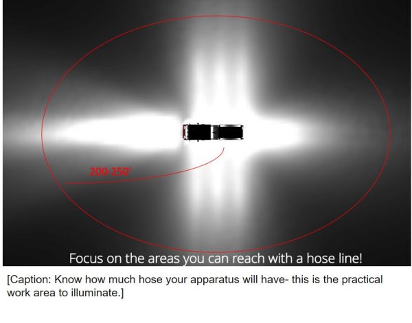 You’ve only got so much hose! The vast majority of the time, when operating off the fire apparatus at night, you will be tethered to the apparatus by a piece of hose. When writing a specification for scene lighting on a fire apparatus, consider the length of hose and the most frequent operating characteristics of the apparatus for scene lighting design. If the truck has 250’ of cross lay, there is no need for scene lights than can shine 1,000 feet down the road. Focus on the areas you can reasonably expect to work in and supplement your scene lighting package with portable or battery/generator/extension cord powered fixtures for the “what if” situations.